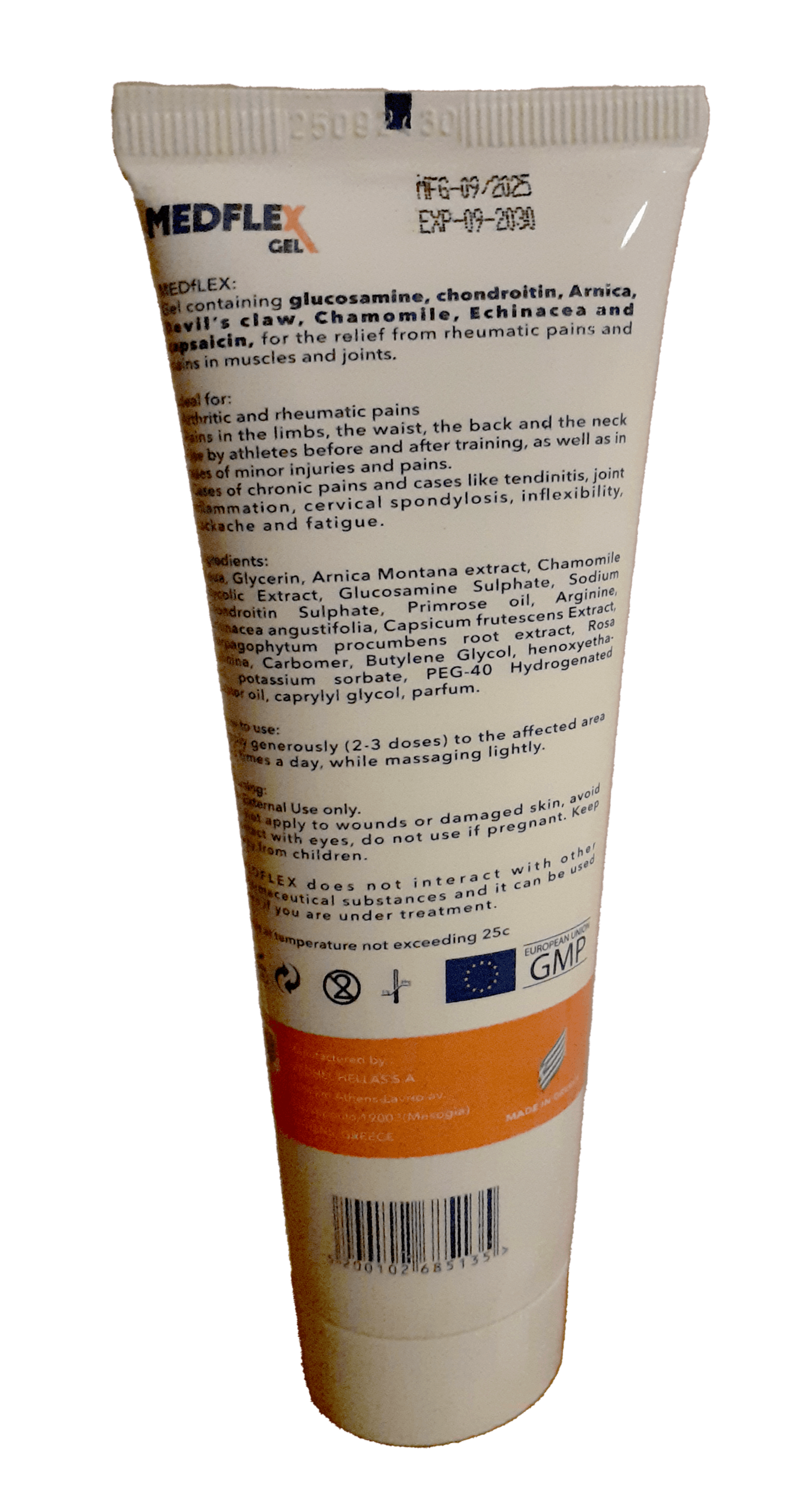 Η κρέμα σώματος Μedflex περιέχει γλουκοζαμίνη, χονδροϊτίνη, εχινάκεια, καψαϊκίνη και άρνικα.